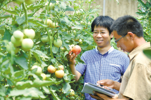 看著長勢(shì)良好的西紅柿,李鋒(左)的臉上掛滿笑容。